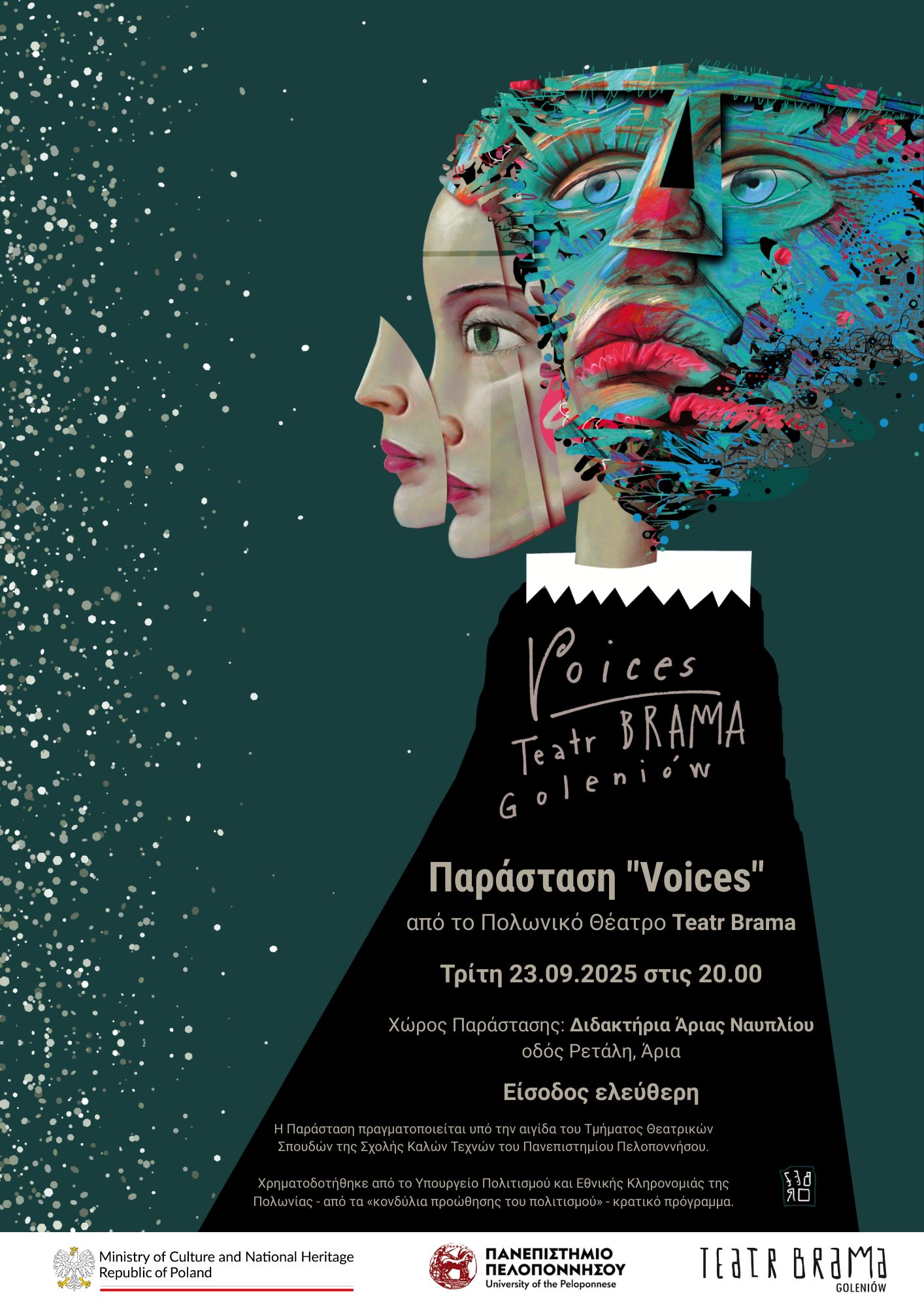 Πρόσκληση Τμήματος Θεατρικών Σπουδών /Παράσταση του πολωνικού θεάτρου Teatr Brama "Voices" στα Διδακτήρια Άριας της Σχολής Καλών Τεχνών Πανεπιστημίου Πελοποννήσου την Τρίτη 23 Σεπτεμβρίου στις 8 μ.μ. (αφίσα, δελτίο τύπου)